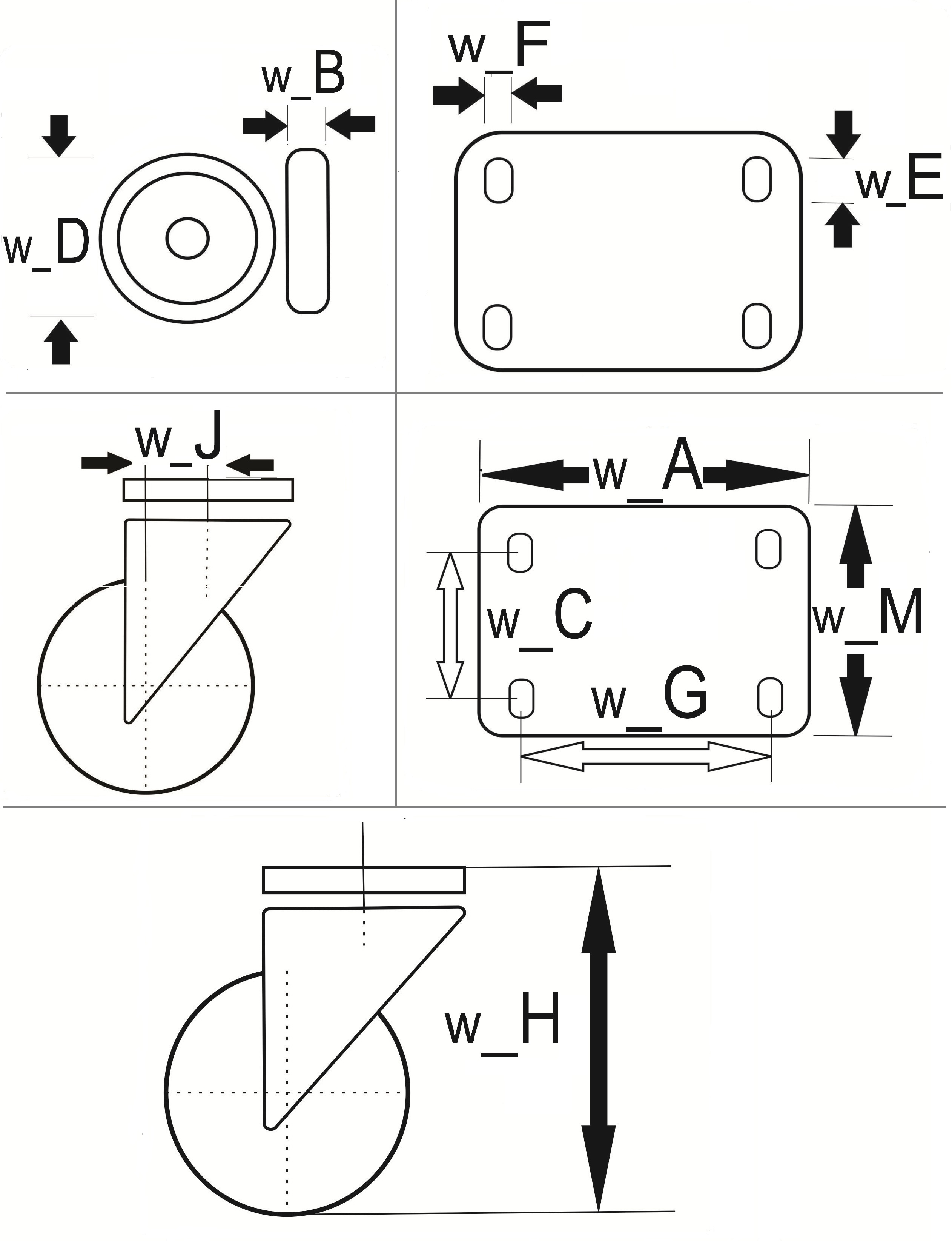 Material furca: tabla din otel presat light; furca: fixa janta: polipropilena; suprafata de rulare: cauciuc gri; rulment: bucsa plana; sistem de prindere/marime: placa in 4 puncte mica; diametrul rotii: 50